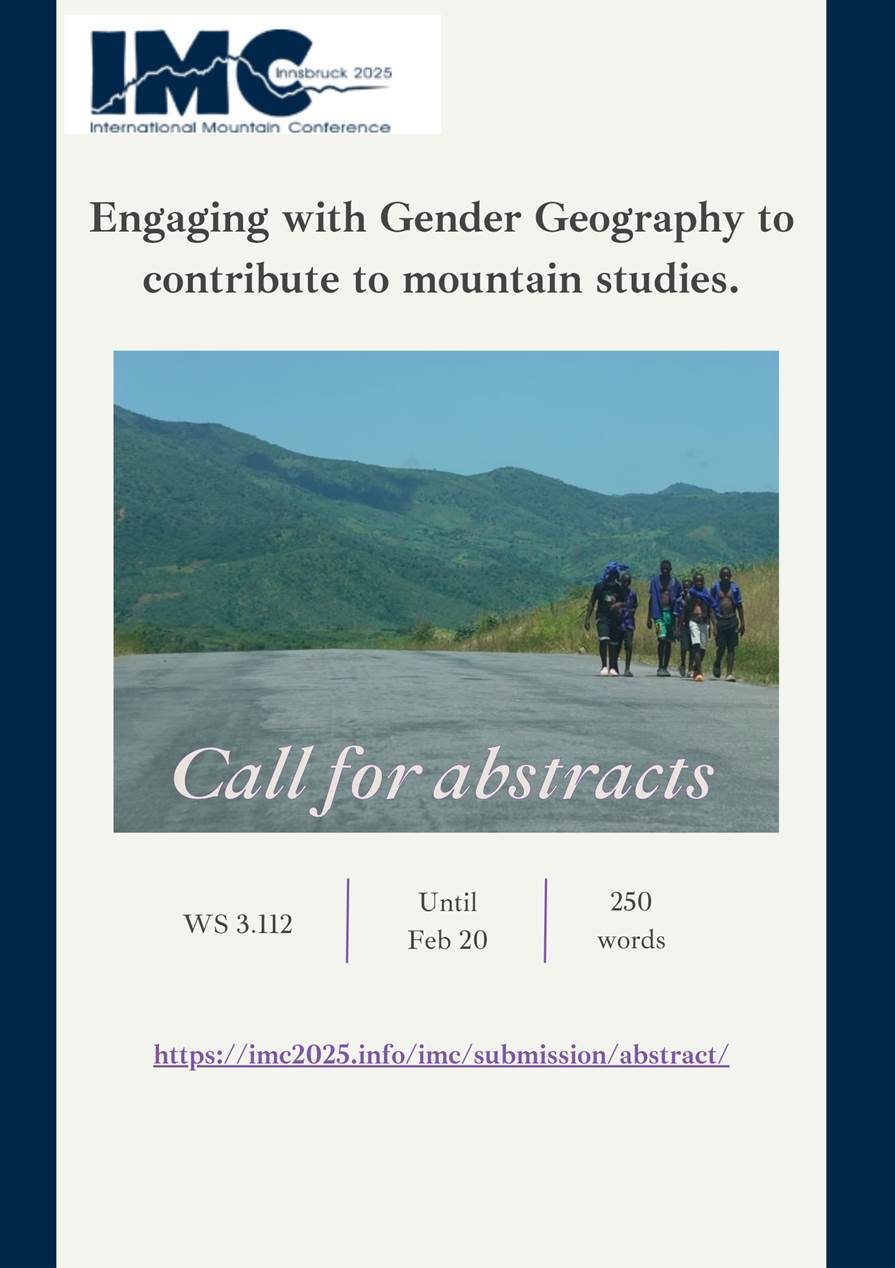 We invite you to send your contributions to our (WS 3.112) Workshop Engaging with Gender Geography to contribute to mountain studies at the International Mountain Conference (IMC), to be held in Innsbruck (Austria), from 14th to 18th of September 2025.